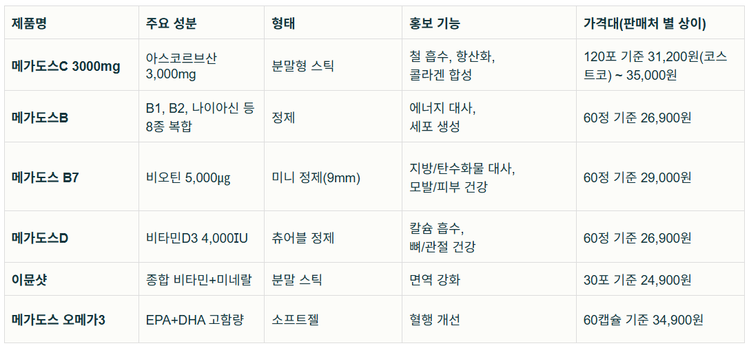 현재 시중에서 판매되고 있는 메가도스 관련 라인업들과 홍보 기능, 그리고 가격대까지 정리를 해 보았어요.